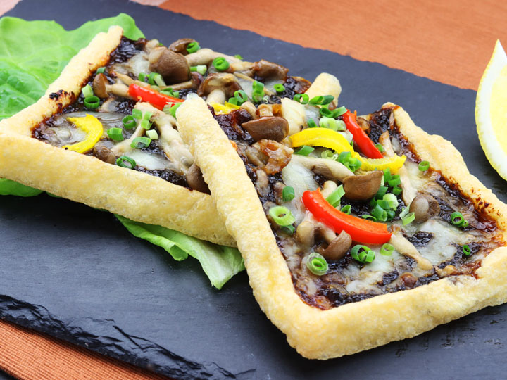 ③油揚げに『黒毛和牛アラ!』をうすく広げ、②とパプリカをのせる。ピザ用チーズをのせてオーブントースターで焼き色が付くまで焼く。